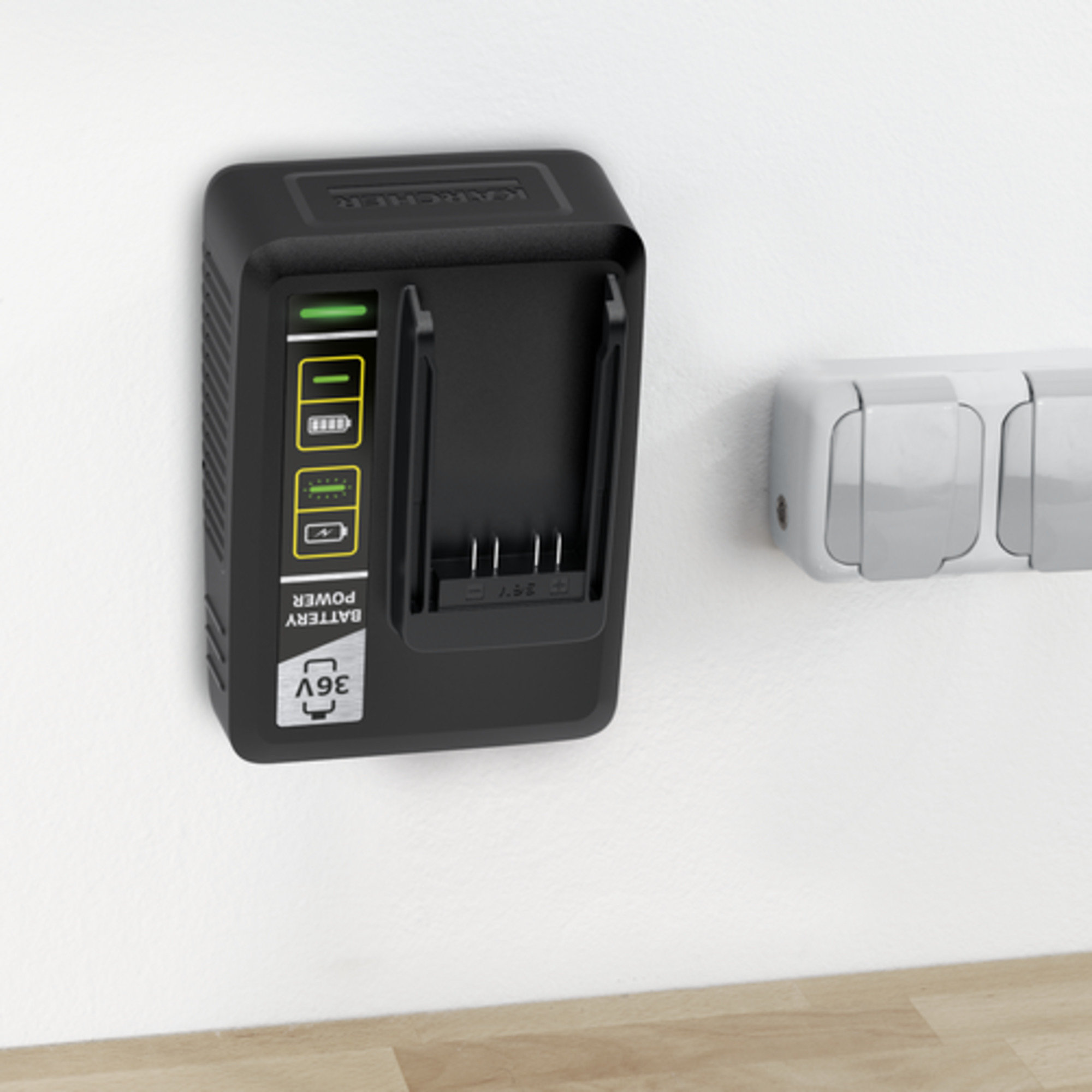 Rýchlonabíjačka pre všetky 36 V vymeniteľné batérie systému 36 V vymeniteľných batérií Battery Power značky Kärcher navráti každej batérii plný výkon za veľmi krátky. Vymeniteľnú batériu 36 V / 2,5 Ah Kärcher Battery Power nabije napríklad na 80 % iba za 45 minút. Nabíjačka má okrem toho integrovaný nástenný držiak.