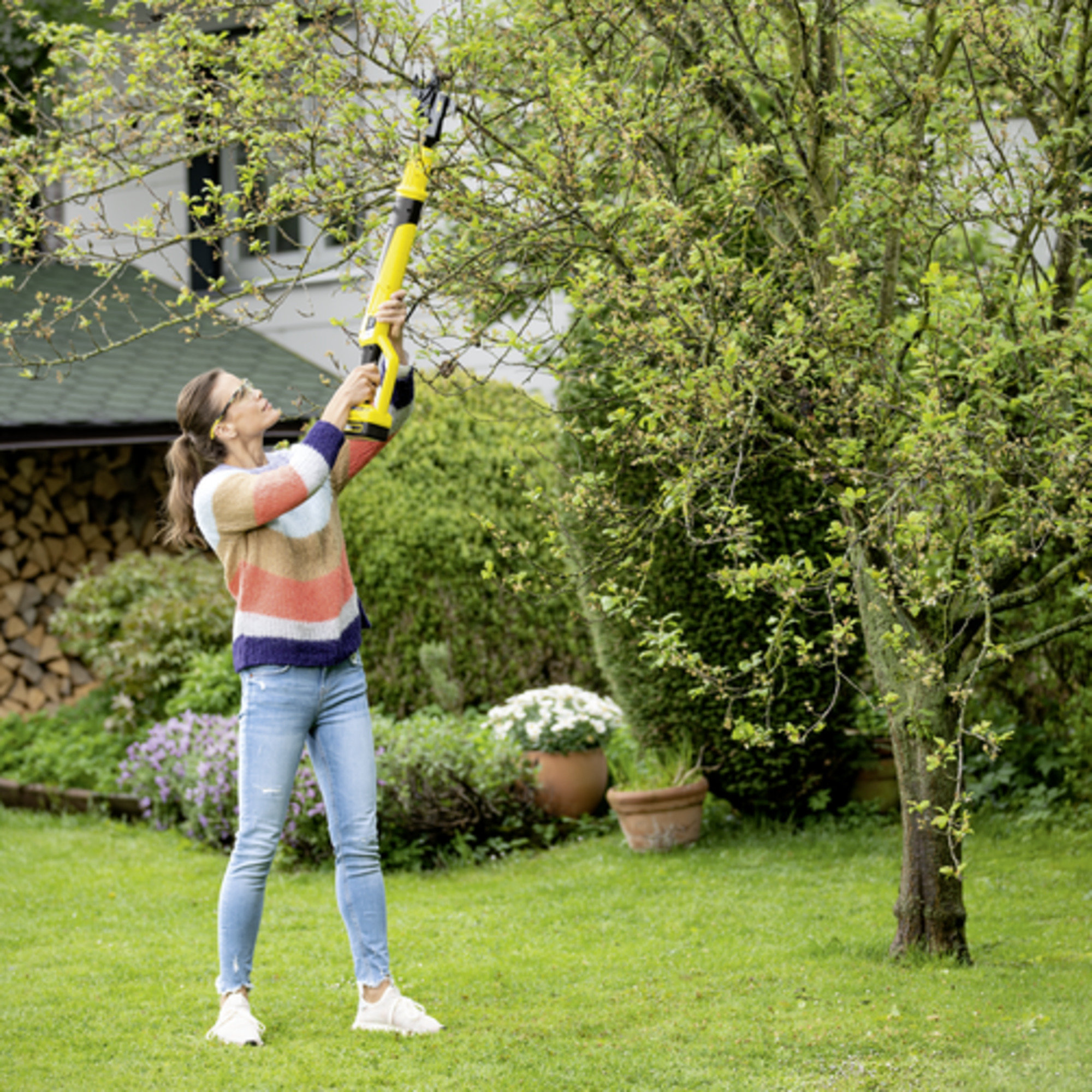 Vetvy s priemerom do 3 centimetrov nie sú pre akumulátorové nožnice na konáre problémom. Poradia si s menšími konármi, či vetvami, a to bez ohľadu na to, ako sú vysoko. S prídavným hákom dosiahnete aj na vyššie rastúce vetvy, ktoré sú tak ihneď v dosahu.