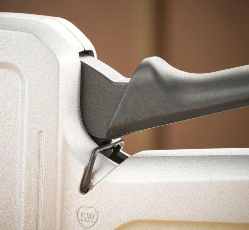Integrovaný zámok rukoväte umožňuje bezpečné uloženie sponkovačky so zníženým rizikom náhodného stlačenia.