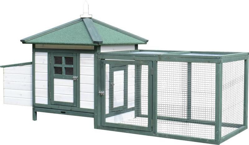 • Dvoudílná konstrukce: uzavřený domeček a prostorný výběh s kovovou sítí.