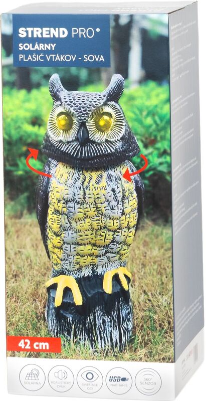 Strend Pro plašič ptáků sova, solární, USB, otočná hlava, zvuk, svítící oči